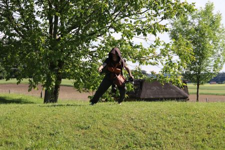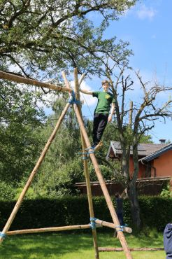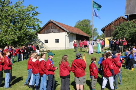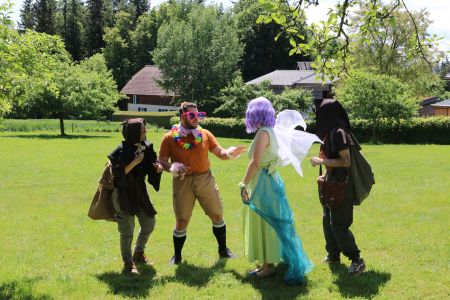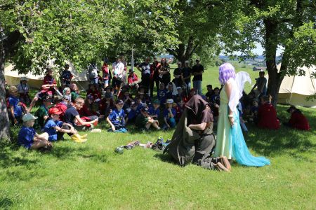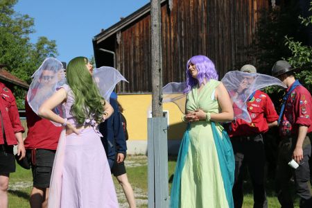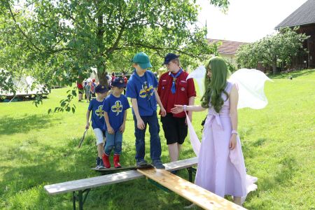 Auch dieses Jahr hat sich wieder am Freitagnachmittag vor Pfingsten eine Traube rotbehemdeter Kinder und Jugendlicher am Salzburger Hauptbahnhof eingefunden. Wo die wohl hinfahren wollen? Richtig! Wir sind dieses Jahr wieder mit der Lokalbahn in unser Pfingstlager gestartet und haben die letzten Meter aufs Lipplgut zu Fuß hinter uns gebracht. Mit guten Wetteraussichten und einer ruhigen ersten Nacht hatten wir den perfekten Start in ein schönes Lager. Aber kaum wollten wir am nächsten Morgen unsere Zelte verlassen, mussten wir feststellen, dass all unsere linken Schuhe verschwunden waren. Mit Zweitschuhen - die natürlich jeder der gut vorbereiteten Pfadis mit dabei hatte - auf Socken, oder kreativen Schuhalternativen aus Holz und Ducktape haben wir uns zum Morgengruß versammelt. Dort besuchten uns direkt zwei Feen, die von ihrem Unfug treibenden Bruder Grummel erzählten und versprachen zu helfen. (Und uns baten eine Liste mit den fehlenden Sachen anzufertigen. Gesagt, getan war die Liste schnell erstellt und dann ging es für CaEx und GuSp auch schon ans Lagerbauten aufstellen.)