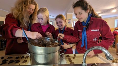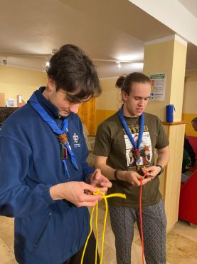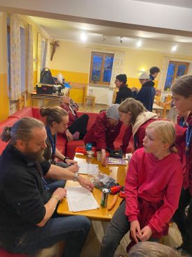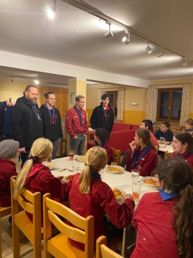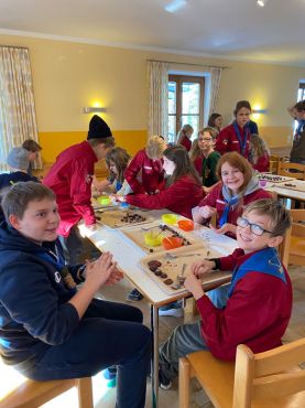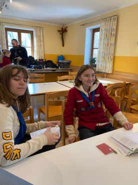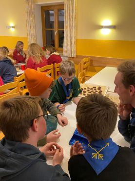 Am 8. Dezember ging es für die GuSp wieder auf Winterlager, diesmal quasi als Auslandslager nach Bayern ins Jugendhaus Marktschellenberg. Wie es sich für ein Winterlager gebührt, wurde der verbliebene Schnee erst einmal für eine Schneeballschlacht genutzt, die natürlich von diversen anderen Spielen gefolgt war. Danach galt es die Zimmer zu beziehen und das Haus zu erkunden. Als Abschluss für den ersten Lagertag wurde nach dem Abendessen ein Filmabend veranstaltet und passenderweise „der Grinch“ angeschaut. – Selbstverständlich mit viel Popcorn. Am nächsten Morgen wurden zur Stimmung passend Weihnachtslieder gesungen und leckere Kekse gebacken, die mit allerlei Streusel und Gold- sowie Silberpulver verziert wurden. Während die Kekse kühlten, gab es hervorragende Kasnocken zu Mittag (danke Gassi) und am Nachmittag einen großen “Stationen lauf“. Nachdem bei besagtem Lauf sowohl wichtige Fragen wie: „Was ist die Antwort auf das Leben, das Universum und den ganzen Rest?“ geklärt, sowie Knoten geübt worden waren, wurden vor dem Abendessen noch fleißig Erprobungen gemacht. Mit einem mit wirklich leckerem Chili vollgeschlagenen Bauch, ging es nach dem Abendessen noch daran, die zuvor gebackenen Kekse bei einem Spieleabend zu vernichten. Derartig gezuckershockt ging es dann auch spät abends ins Bett. Letzter Tag, 8 Uhr morgens, Frühstückszeit: sichtlich (de-)motiviert ging es mit dem Ausblick das gesamte Haus putzen zu müssen aus den Betten und ans Werk. Nach getaner Arbeit ging es erneut fleißig mit Erprobungen weiter, sowie mit einer großen Runde Wehrwolf. Nach einem schnellen Mittagessen ging unser Lager dann auch am Nachmittag wieder zu Ende.