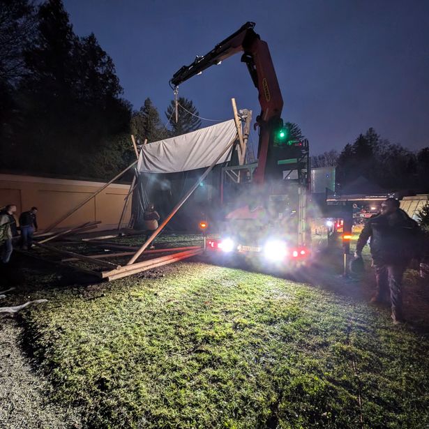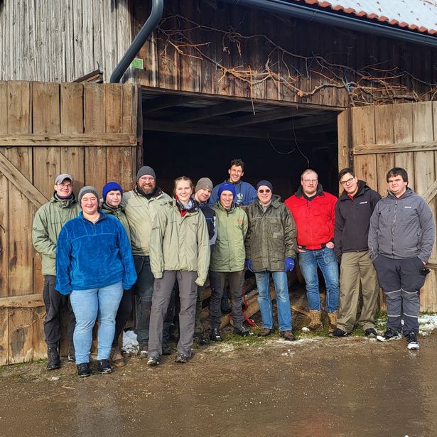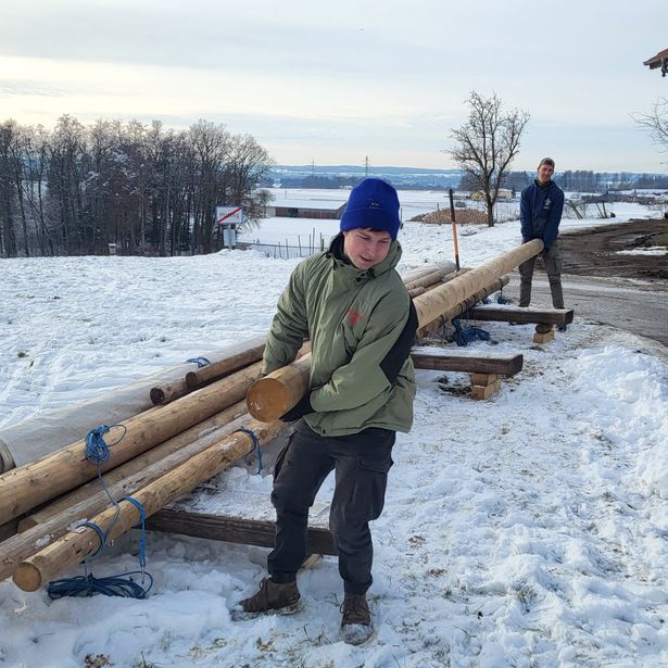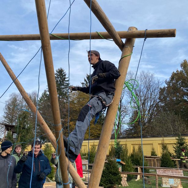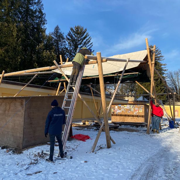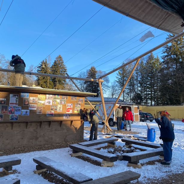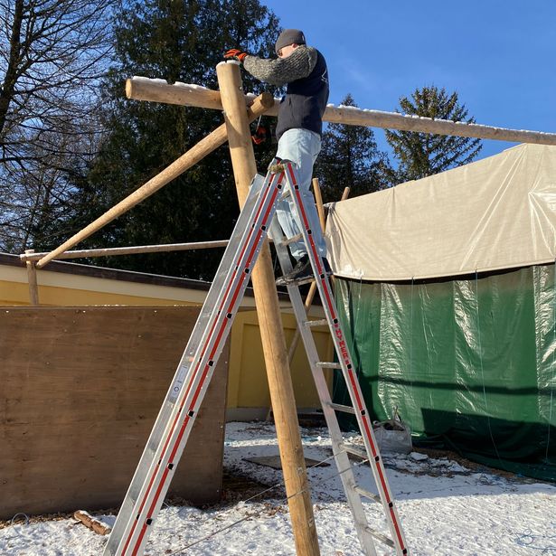 An Tag 1 wurden Löcher gebohrt, das Gerüst aufgebaut und abschließend das Dach und die Giebelstange mithilfe eines Krans hochgehoben und befestigt. Der Zwischenstand ist schon vielversprechend – dieses Jahr waren wir sogar vor unserem Zeitplan! Zum Glück hat dieses Jahr auch das Wetter mitgespielt und besonders an Tag 2 wurde dann viel erreicht: wir haben die beiden Hütten aufgebaut und wasserdicht gemacht, das große Dach richtig abgespannt, alle Bänke repariert und erhöht, fast 2 Tonnen Briketts eingeschichtet, die Beleuchtung und Lautsprecher aufgehängt, viele viele Steine geschleppt, um die Feuerstellen anzulegen und abschließend noch die Weihnachtsbäume aufgestellt.